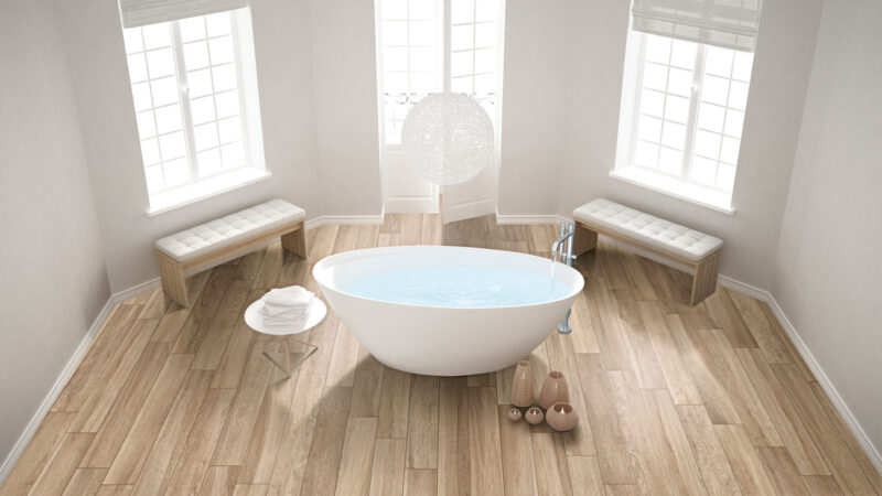 Formatet 20x120cm gjennskaper utseende av lange trebord. Flisene kan brukes både som vegg- og gulvfliser og de kan også brukes utendørs. 5x5mosaikken gjør det lett å bruke denne flisen i mindre bad der hvor fall kan være et problem.